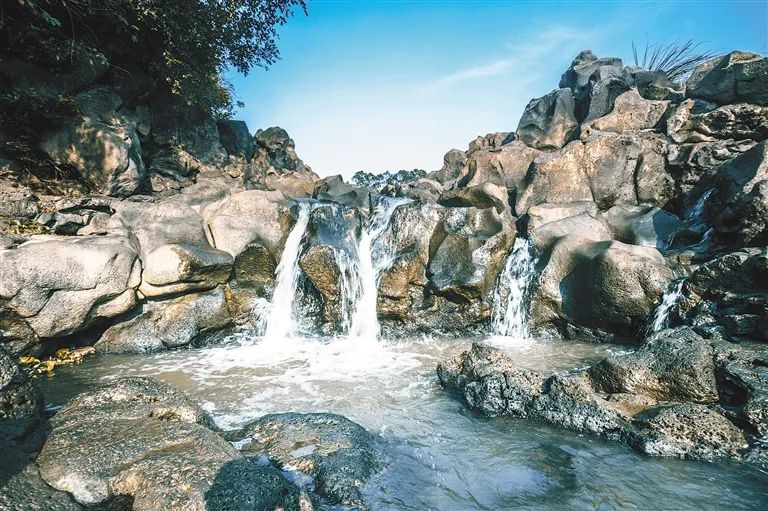 百仞滩岩石如垒,石浸水中,或方圆或冷峭或圆溜,或兀立或酣睡或沉思或跳跃,或龙虎相搏,或水牛沐洗,或老翁对弈,或渔翁垂钓……还有一处天然“蒸酒锅具”,水从石上滴下,水声叮咚有韵,经年不绝。每一个岩石都是一尊风格迥异的艺术品,百仞石滩组成了古朴、粗犷的艺术群体,在荒野里展览悠悠千年。